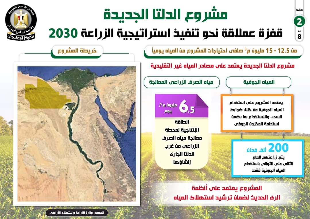 وبمجرد الانتهاء، سيكون لدى دلتا الجديدة القدرة على زراعة 9200 كيلومتر من الأراضي في الصحراء الغربية لزيادة الأراضي الخصبة للزراعة، وتحديداً القمح.