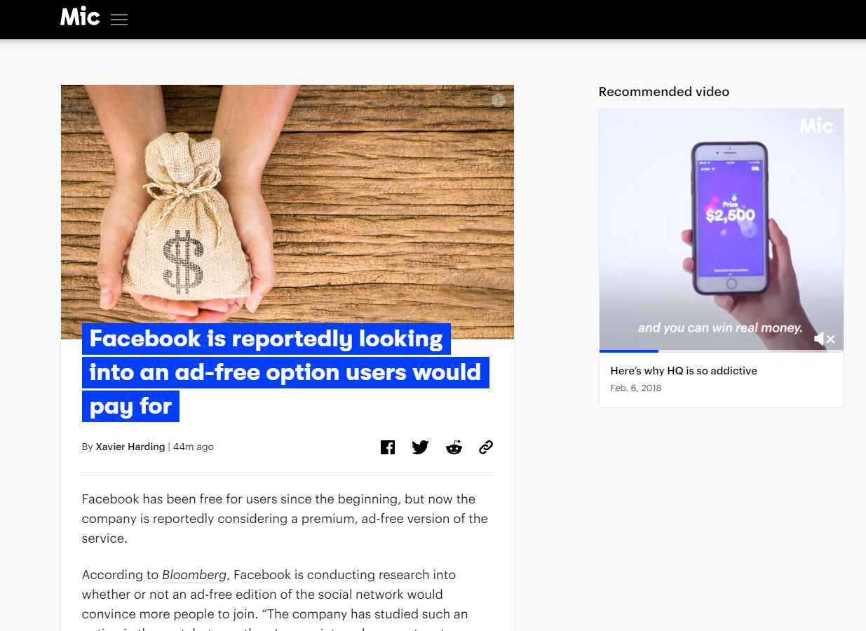 تعد قصة الموقع الإخباري Mic الاكثر رعبا حاليا، الموقع الذي حقق 192 مليون مشاهدة خلال أبريل 2017 لم تعد الزيارات الخاصة به تتجاوز 20 مليون خلال أبريل المنصرم، فيس بوك يحاول تحطيم الصحافة الإلكترونية وما يحدث لا يجب أن نسكت عنه.