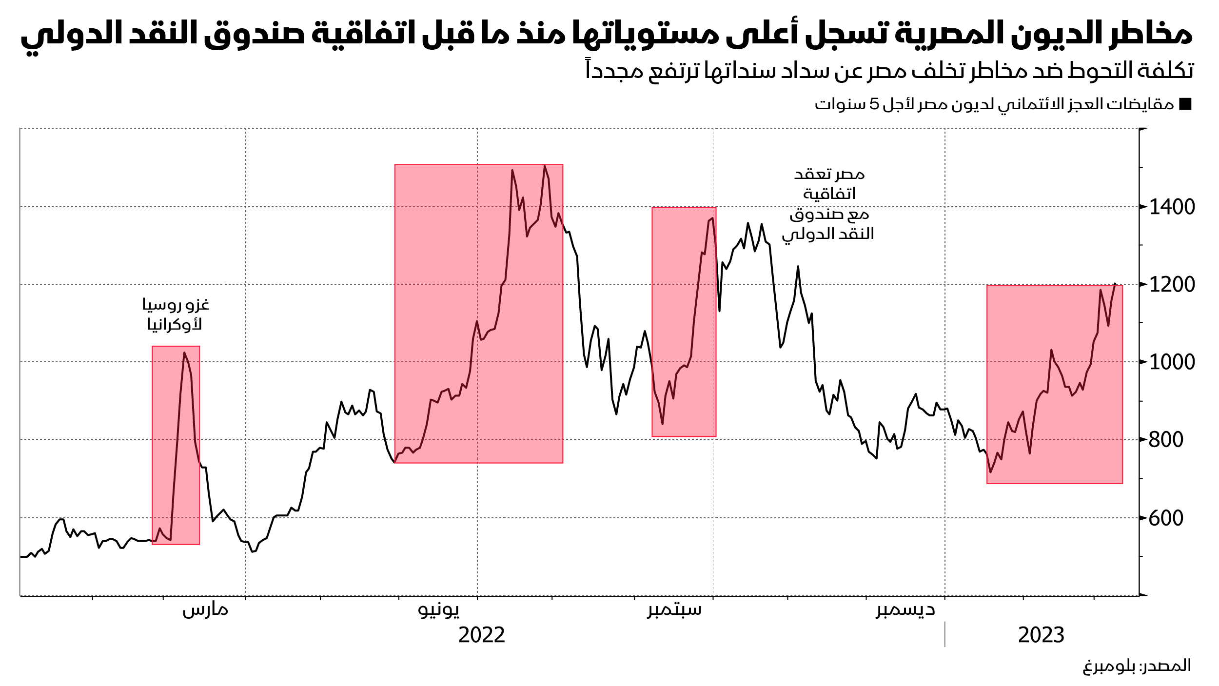 ازدادت تكلفة التحوط ضد مخاطر تخلف مصر عن سداد سنداتها التي تصدرها، وقد حصل هذا من قبل اتفاقية البلد الأفريقي العربي مع صندوق النقد الدولي.