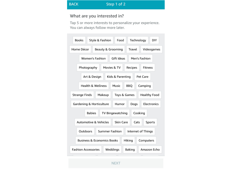مباشرة بعد الولوج إلى هذه الشبكة الإجتماعية ستجد أمامك شاشة تطلب منك تحديد اهتماماتك، وتشمل هذه القائمة الكثير من الإهتمامات ومنها الكتب والأزياء والملابس والأغذية والتكنولوجيا وإنترنت الأشياء والديكور والجمال إضافة إلى السياحة والألعاب الإلكترونية وأفكار الهدايا والفن والتصميم والحيوانات والصحة.