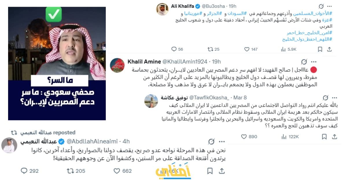 عبر معظم الكتاب والمؤثرين الخليجيين على منصة اكس والمنابر المختلفة عن صدمتهم من فرحة المصريين بالهجمات الايرانية على دول الخليج وهو أمر لاحظناه بالفعل منذ اليوم الأول للحرب.