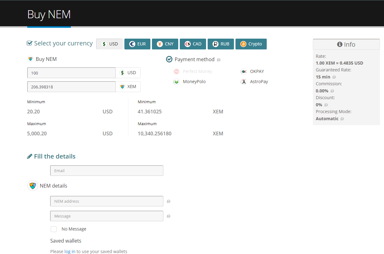 كما ترى هي واجهة بسيطة جدا ويمكنك التعامل معها بسرعة، يمكنك منها شراء عملة NEM بالدولار أو اليورو أو اليوان الصيني أو بالعملات الرقمية الأخرى في حالة كنت تملكها.