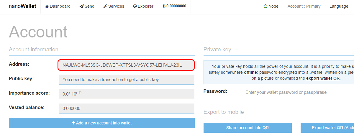 بعدها سجل الدخول وادخل إلى المحفظة وبالضغط على Account ستجد عنوان المحفظة الخاصة بك والتي يمكنك ارسال وحدات NEM.