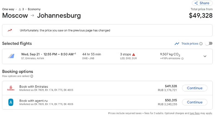 وبناء على ذلك أقدمت شركات الطيران على رفع الأسعار إلى مستويات قياسية غير مسبوقة ولم نسمع بها من قبل ولا يتعلق الأمر بارتفاع سعر التذكرة إلى 5000 دولار من موسكو إلى دبي، بل أيضا ارتفاع سعر التذكرة من روسيا إلى جنوب أفريقيا نحو 49 ألف دولار.